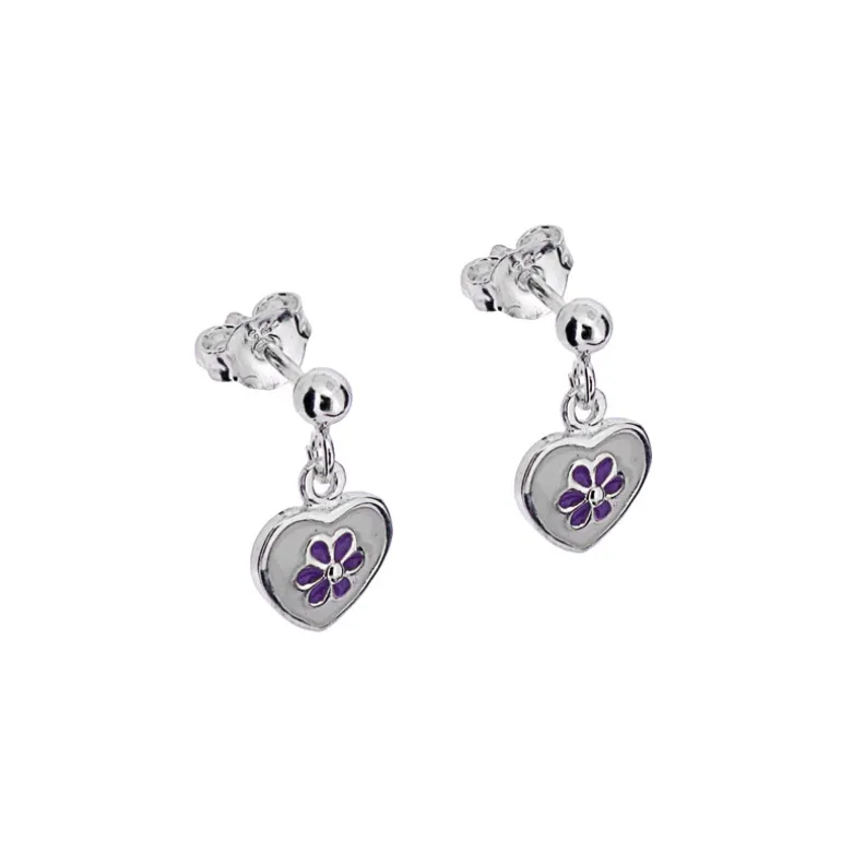 Hängande örhängen med hjärta och rosa blomma i äkta silver 925.