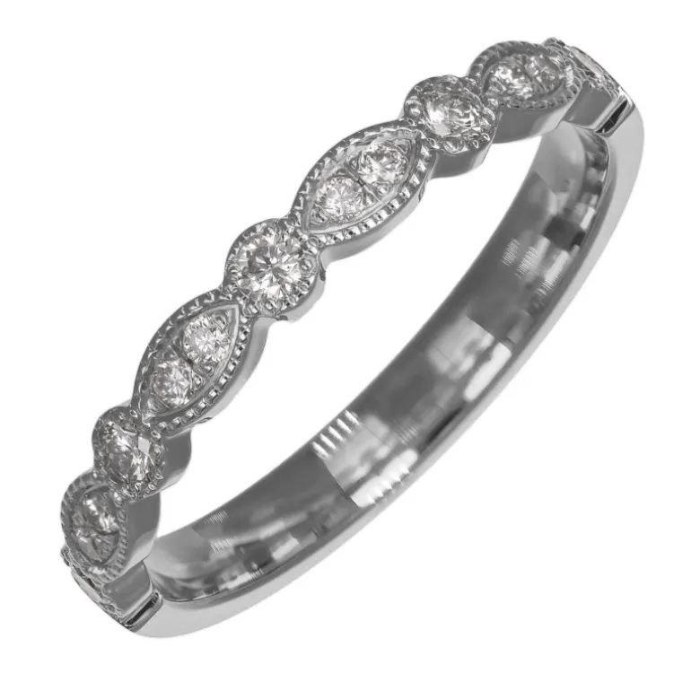 Vacker förlovningsring, vigselring och smyckesring i vitt guld med diamanter snyggt fattade i romber varvat med cirklar och små kulor som dekor, så kallat milligriff. Ringen heter Boda och ingår i vår egen kollektion med förlovningsringar och vigselringar Dalecarlia Love Collection.