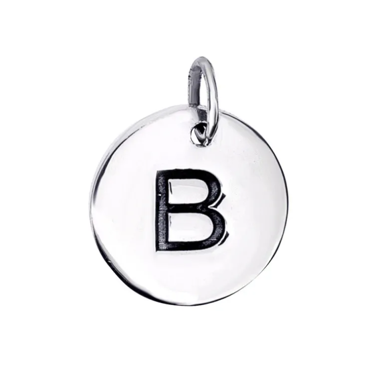Bokstavsberlock, smycke med bokstav B djupt graverad. Gravyren är oxiderad, dvs bokstaven syns bra då den är lite svartgrå i färgen. Ytterdiameter 12 mm. Material äkta silver 925.