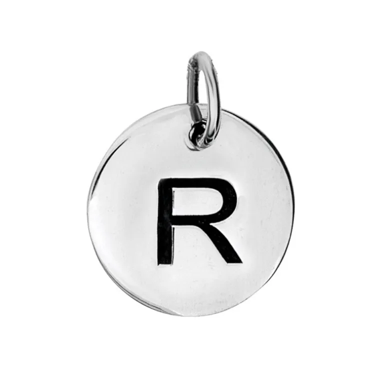 Bokstavsberlock, smycke med bokstav R djupt graverad. Gravyren är oxiderad, dvs bokstaven syns bra då den är lite svartgrå i färgen. Ytterdiameter 12 mm. Material äkta silver 925.