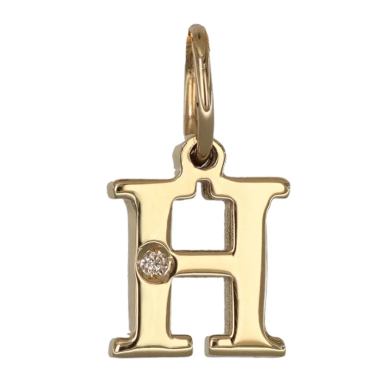 Bokstavssmycke i äkta guld 9 karat, bokstav H med liten diamant 0,005 carat. Höjd på bokstaven 8 mm, höjd inklusive ögla 11,5 mm, tjocklek 1,3 mm. Smycke med bokstav tillverkad i 9 karat guld, en legering bestående av 37,5 % guld och resten silver och koppar.