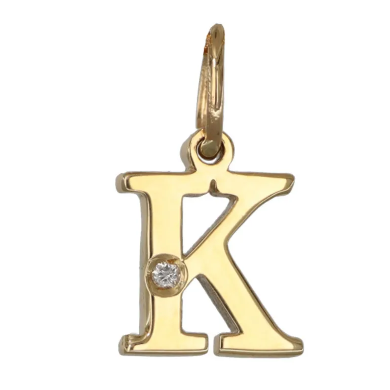 Bokstavssmycke i äkta guld 9 karat, bokstav K med liten diamant 0,005 carat. Höjd på bokstaven 8 mm, höjd inklusive ögla 11,5 mm, tjocklek 1,3 mm. Smycke med bokstav tillverkad i 9 karat guld, en legering bestående av 37,5 % guld och resten silver och koppar.