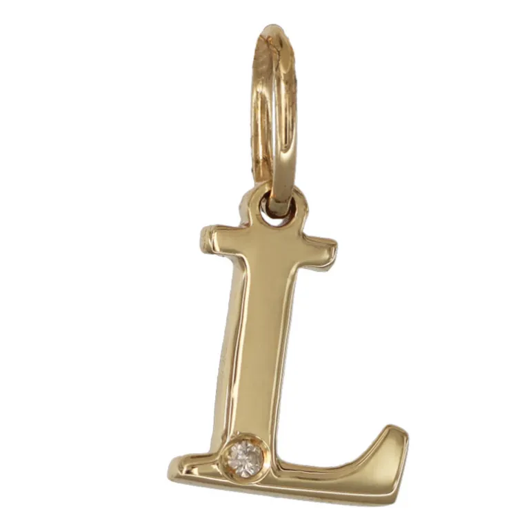 Bokstavssmycke i äkta guld 9 karat, bokstav L med liten diamant 0,005 carat. Höjd på bokstaven 8 mm, höjd inklusive ögla 11,5 mm, tjocklek 1,3 mm. Smycke med bokstav tillverkad i 9 karat guld, en legering bestående av 37,5 % guld och resten silver och koppar.