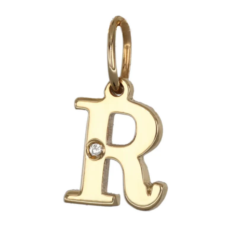 Bokstavssmycke i äkta guld 9 karat, bokstav R med liten diamant 0,005 carat. Höjd på bokstaven 8 mm, höjd inklusive ögla 11,5 mm, tjocklek 1,3 mm. Smycke med bokstav tillverkad i 9 karat guld, en legering bestående av 37,5 % guld och resten silver och koppar.