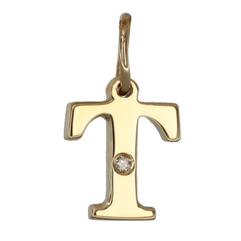 Bokstavssmycke i äkta guld 9 karat, bokstav T med liten diamant 0,005 carat. Höjd på bokstaven 8 mm, höjd inklusive ögla 11,5 mm, tjocklek 1,3 mm. Smycke med bokstav tillverkad i 9 karat guld, en legering bestående av 37,5 % guld och resten silver och koppar.
