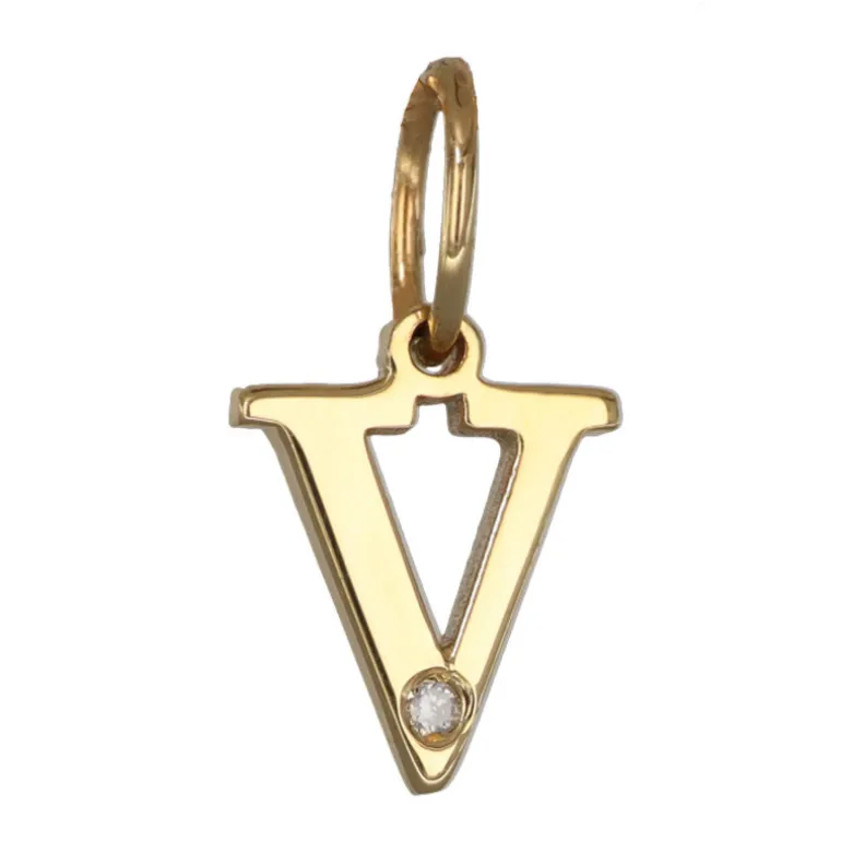 Bokstavssmycke i äkta guld 9 karat, bokstav V med liten diamant 0,005 carat. Höjd på bokstaven 8 mm, höjd inklusive ögla 11,5 mm, tjocklek 1,3 mm. Smycke med bokstav tillverkad i 9 karat guld, en legering bestående av 37,5 % guld och resten silver och koppar.