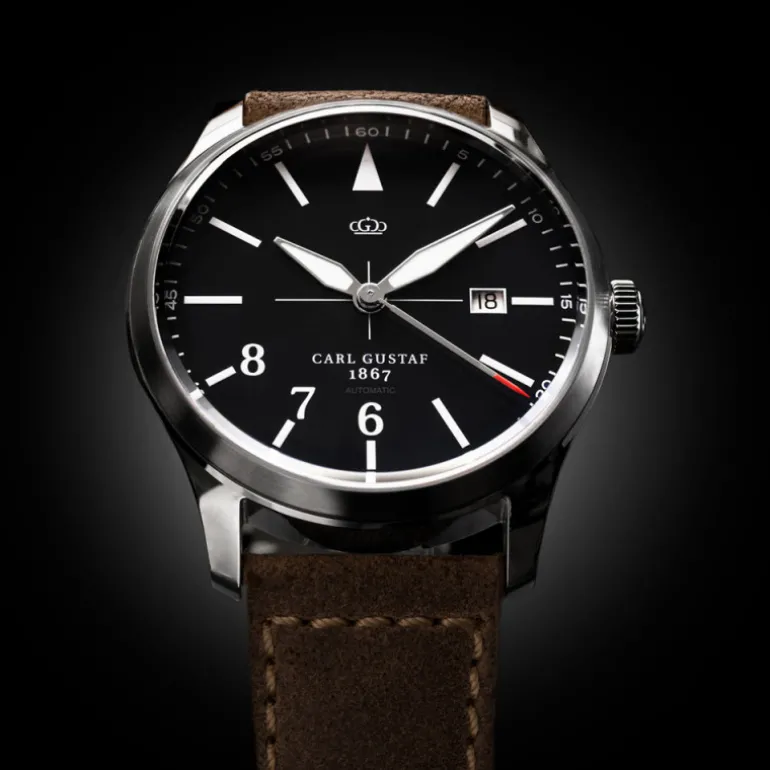 Jordskott, klocka automat från Carl Gustaf med svart urtavla och brunt läderband. Safirglas. Snyggt etui ingår.