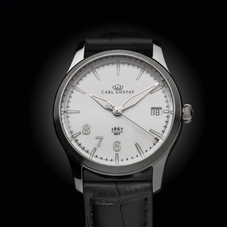 Klocka från Carl Gustaf Watches i lite mindre modell passande dam eller liten herr med vit urtavla, boett i stål och svart läderband. Designad i Sverige. Tillverkad i Schweiz.