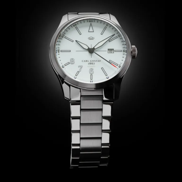 Klocka automat från Carl Gustaf Wathes, m1867 Cheramic White. Snygg vit urtavla, boett och länk i rostfritt stål.