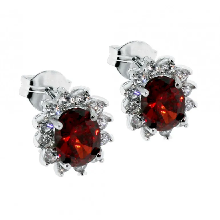Carmoséörhängen, örhängen i äkta silver 925 med röda stenar i mitten omgiven av vita stenar.