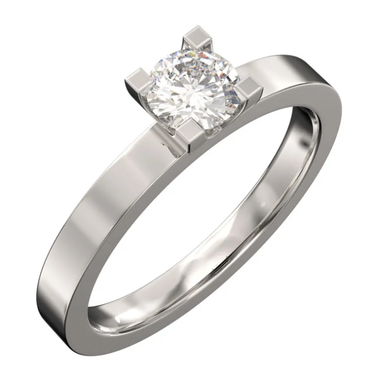 Solitär ring, förlovningsring och vigselring med labbdiamant, syntetisk diamant. Slät rak flack ring med stilren fattning med fyra klor samt en laboratoriediamant i storlek 0,40 carat. Tillverkad i återvunnet vitt guld 18 karat. Modellen heter Dalfors och ingår i Dalecarlia Love Collection, förlovningsringar och vigselringar tillverkade i vår egen guldsmedsverkstad.