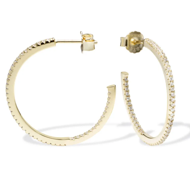 Emmy hoops guldförgyllt äkta silver med glittrande stenar på framsidan och även på insidan bak. Material äkta silver och stenarna vita cubik zirkoner. Ytterdiameter 29 mm, bredd 1,7 mm. Tänk på att ta av förgyllda smycken när ni sportar, duschar och badar så håller de sig fina längre.