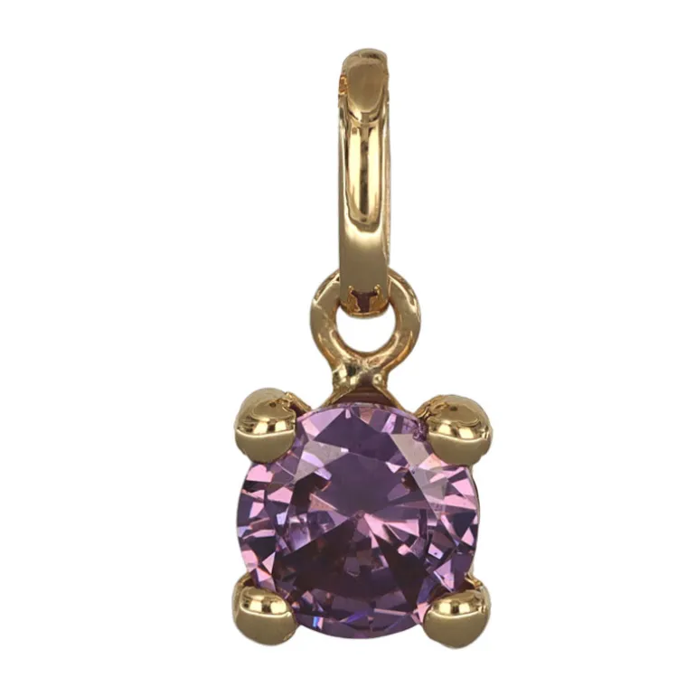 Månadssten smycke för månad februari äkta guld 18 karat. Storlek på stenen 5 mm i diameter, höjd på smycket inklusive ögla 11 mm. Färgad syntetisk sten liknande en ametist.