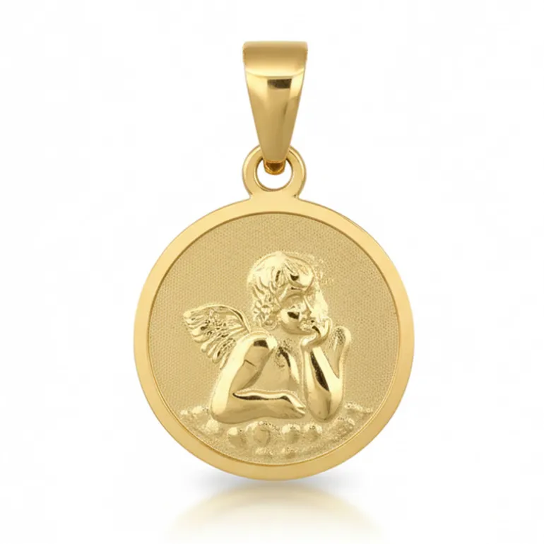 Rund guldberlock med liten ängel i 18 karat guld.