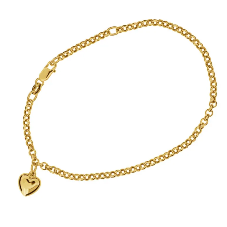 Guldarmband med berlock i form av slätt klassiskt blankt hjärta. Länken är en rund ärtlänk i bredd 2,8 mm.