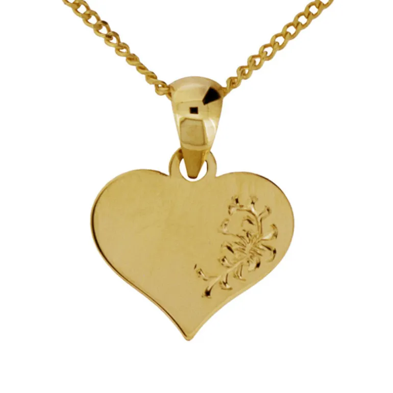 Halsband med platt guldhjärta smycke, hjärta i äkta guld 18 karat med blomgravyr på ena sidan.