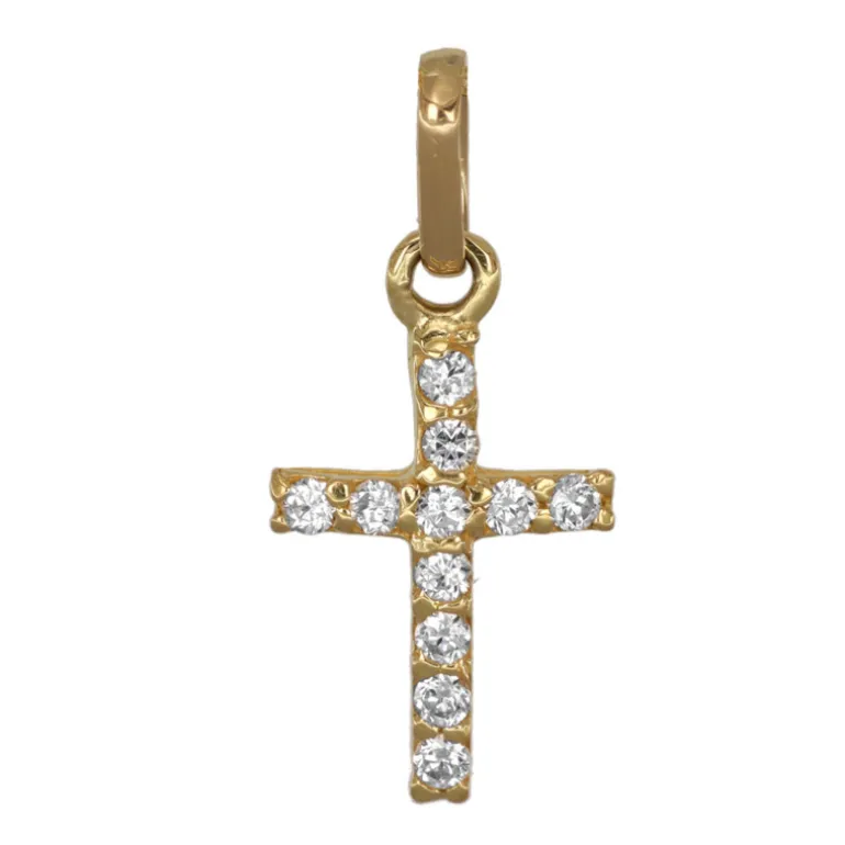 Guldkors med vita glittrande stenar, cubik zirkoner, material äkta guld 18 karat. Höjd på korset inklusive ögla 16,5 mm, bredd 7,5 mm.