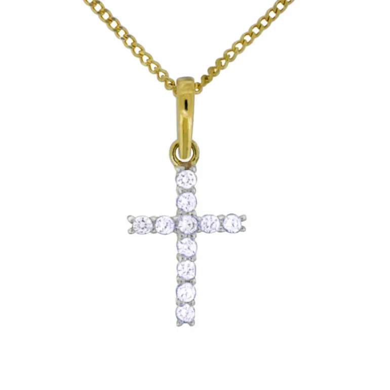 Guldhalsband med smycke med kors, guldkors med glittrande syntetiska cubik cirkoner.
