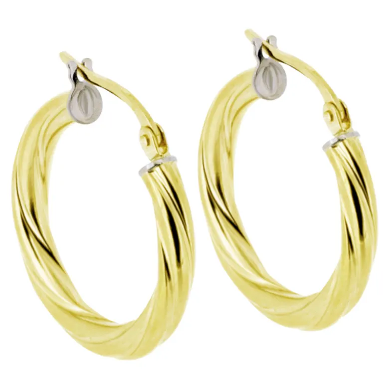 Guldörhängen, ringar och creoler i 18 karat guld med vridet mönster. Ytterdiameter 20 mm, bredd 3 mm.