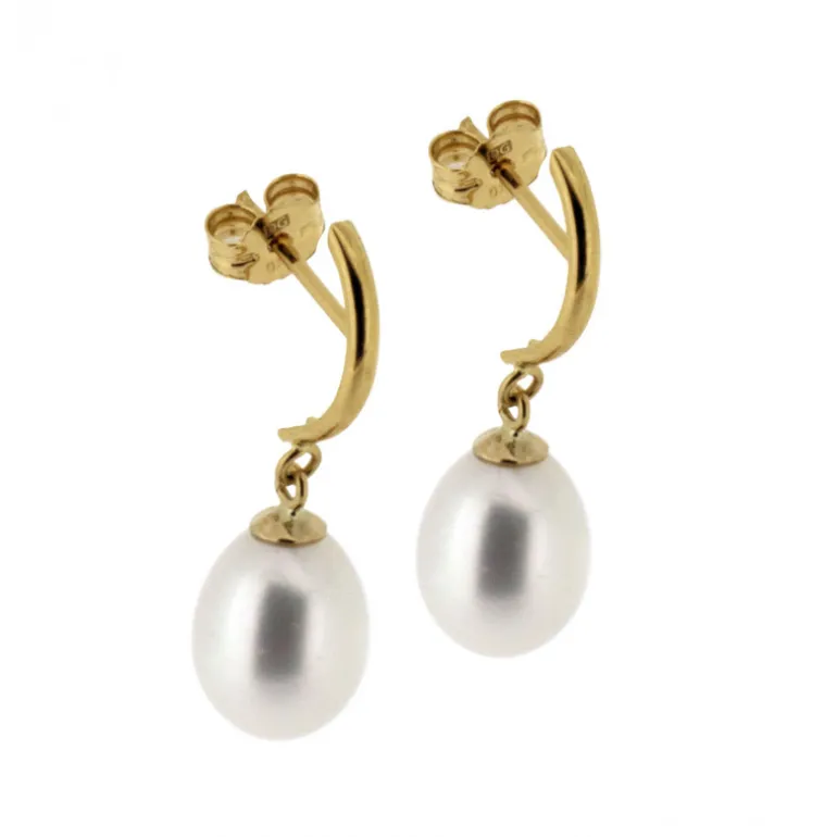 Hängande guldörhängen 18 karat guld med vita sötvattenspärlor.