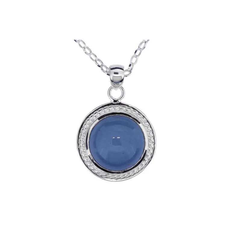 Halsband med blå bergslagssten infattad i äkta silver med vriden kant som dekoration.