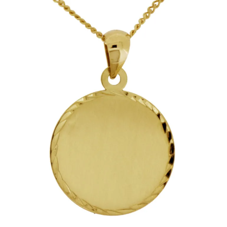 Halsband med rund berlock, smycke och kedja i äkta guld 18 karat med blanka glittrande fasetter på kanten av smycket.