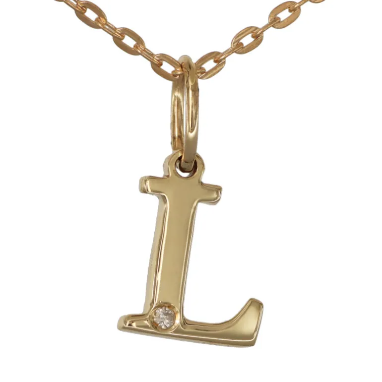 Halsband med smycke bokstav L, bokstavshalsband i äkta guld 9 karat samt en liten diamant 0,005 carat. Bokstavssmycke, höjd på bokstaven 8 mm, höjd inklusive ögla 11,5 mm, tjocklek 1,3 mm. Kedja modell ankar, bredd 0,6 mm artikel 9-50-0001. Material äkta guld 9 karat, en legering av 37,5% guld och resten silver och koppar.