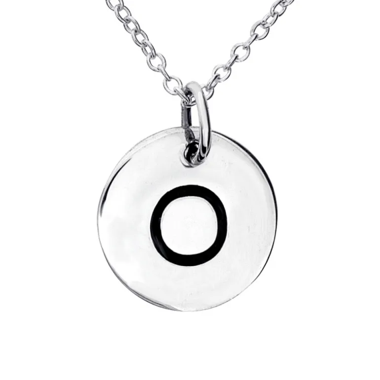 Halsband med rund berlock bokstaven O graverad, kedja ingår. Äkta silver 925.