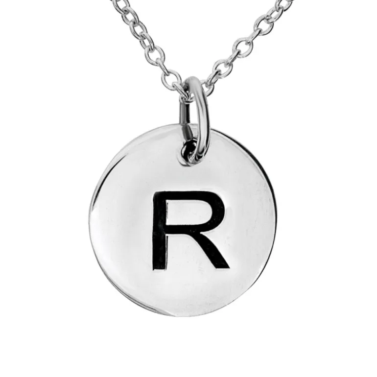 Halsband med rund berlock bokstaven R graverad, kedja ingår. Äkta silver 925.