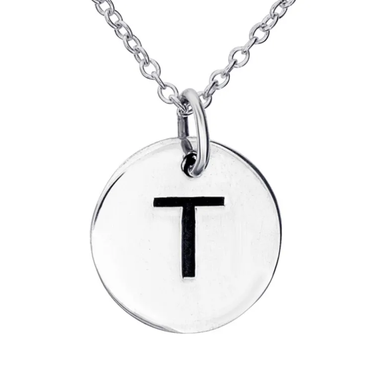 Halsband med rund berlock bokstaven T graverad, kedja ingår. Äkta silver 925.