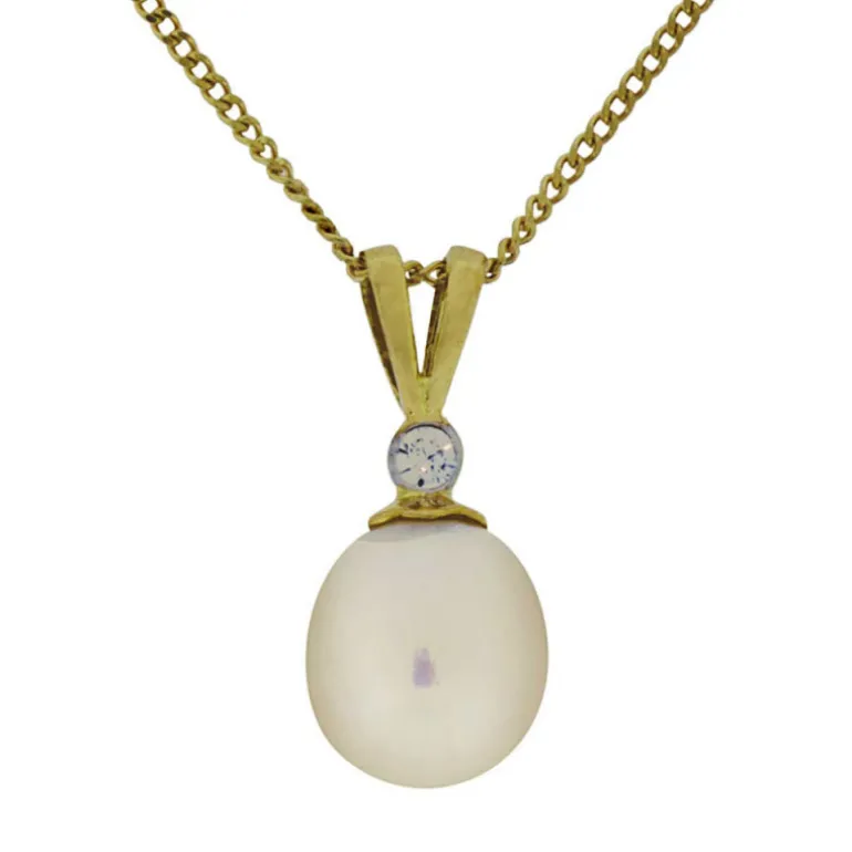 Halsband med odlad sötvattenspärla och liten gnistrande sten och ögla, infattning och ögla i äkta guld 18 karat. Guldkedja modell pansar.