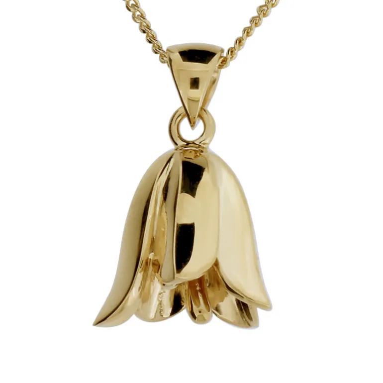 Vackert halsband med blomma stor blåklocka, ängsklocka och guldkedja pansarkedja. Material äkta guld 18 karat. Blåklocka är Dalarnas landskapsblomma och även framröstad som Sveriges nationalblomma.