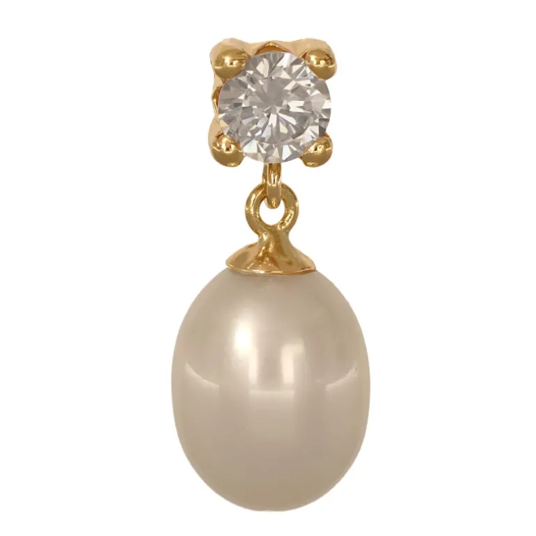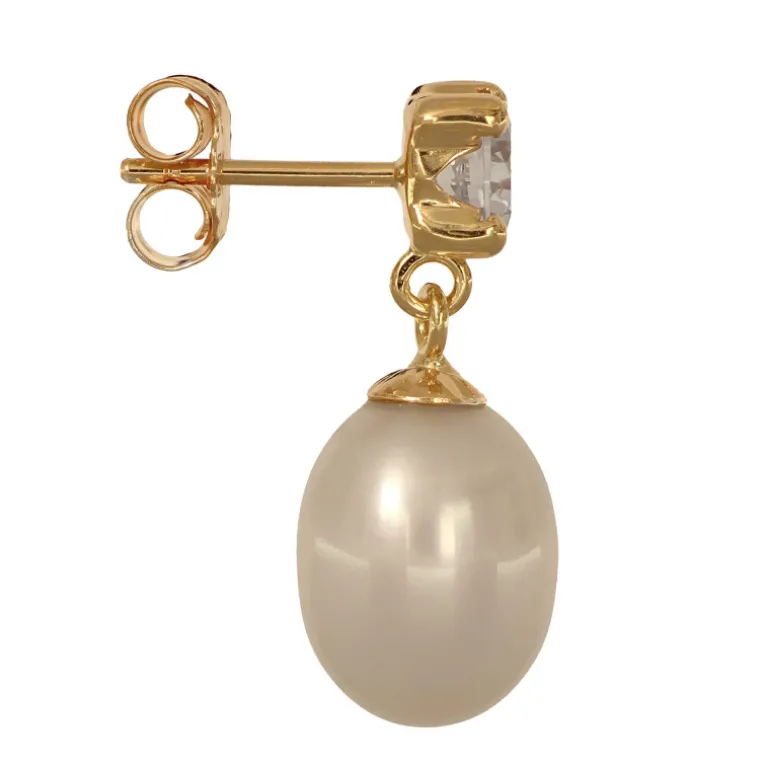 Hängande pärlörhängen, örhängen med droppformade odlade sötvattenspärlor och vit gnistrande sten upptill. Material äkta guld 18 karat.