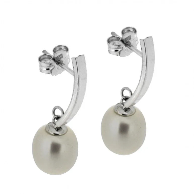 Hängande guldörhängen i 18 karat vitguld med vita odlade sötvattenspärlor på böjda stavar.
