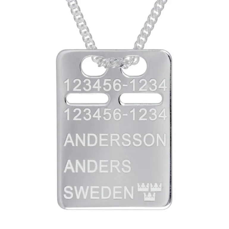 Halsband med ID-bricka och kedja modell pansar i äkta silver. Storlek på brickan 16 x 22 mm. Välj önskad längd på kedjan vid beställningen. Gravyr ingår.