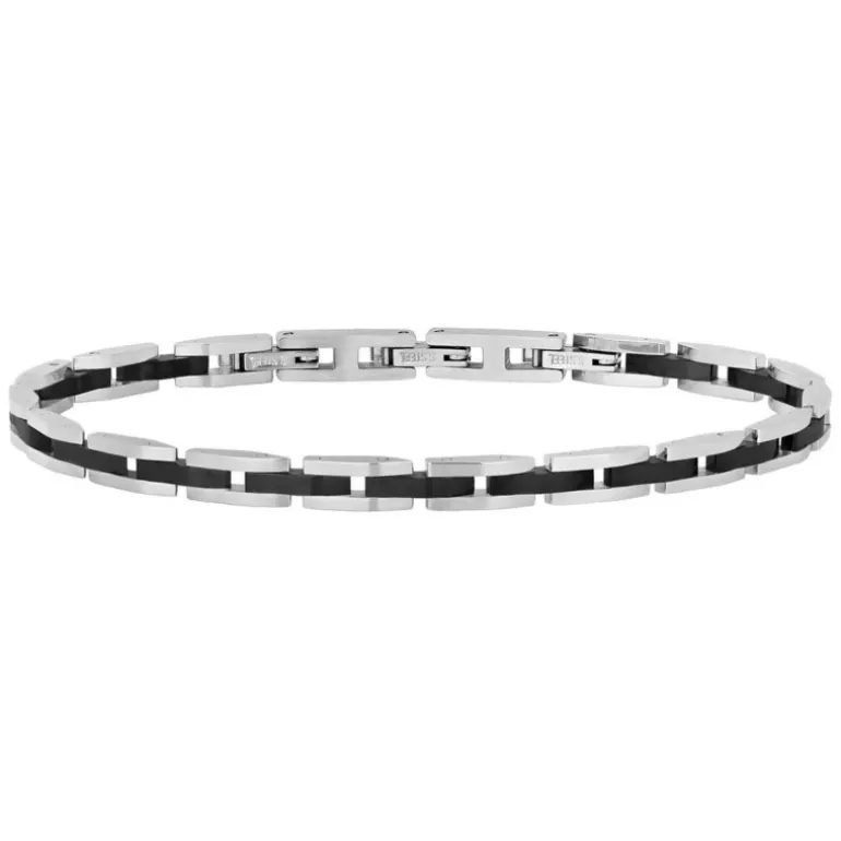 Jason, armband i rostfritt stål med mörka inslag i mitten. Längd 21 cm men går enkelt att korta genom att ta bort länkar. Bredd 5 mm.