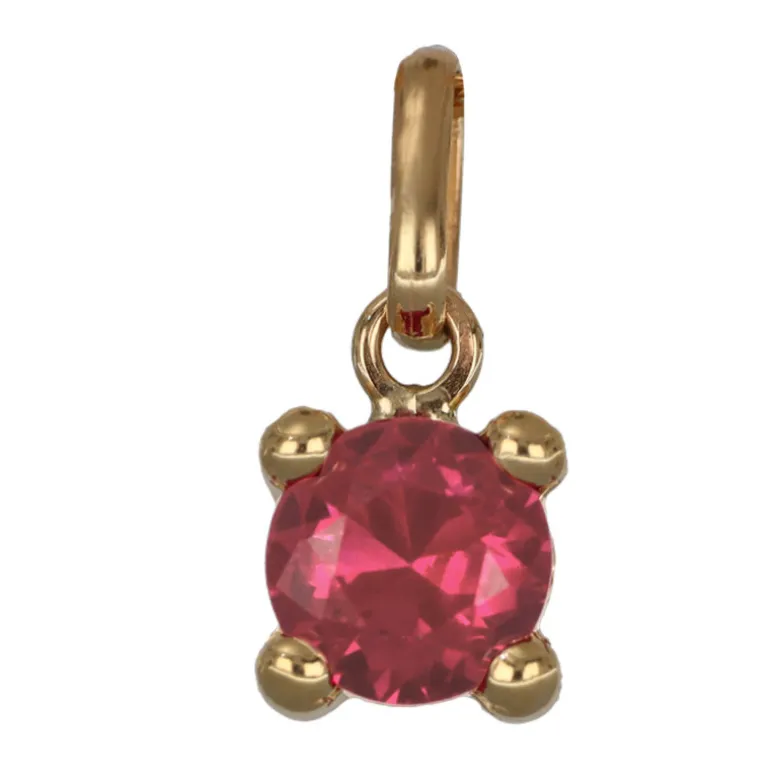 Månadssten smycke för månad juli äkta guld 18 karat. Storlek på stenen 5 mm i diameter, höjd på smycket inklusive ögla 11 mm. Färgad syntetisk sten liknande rubin.