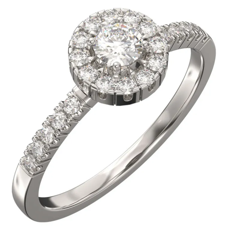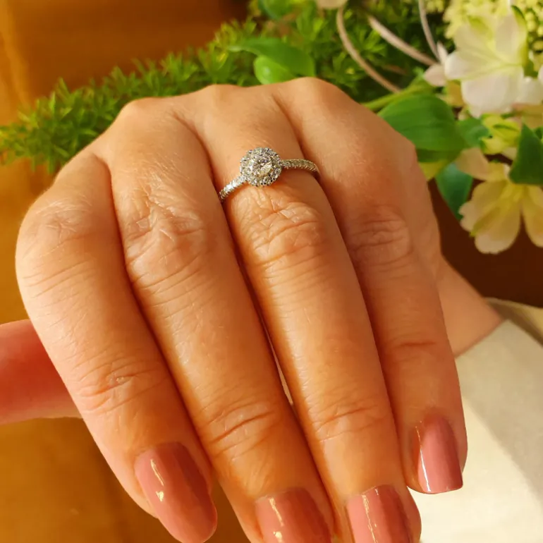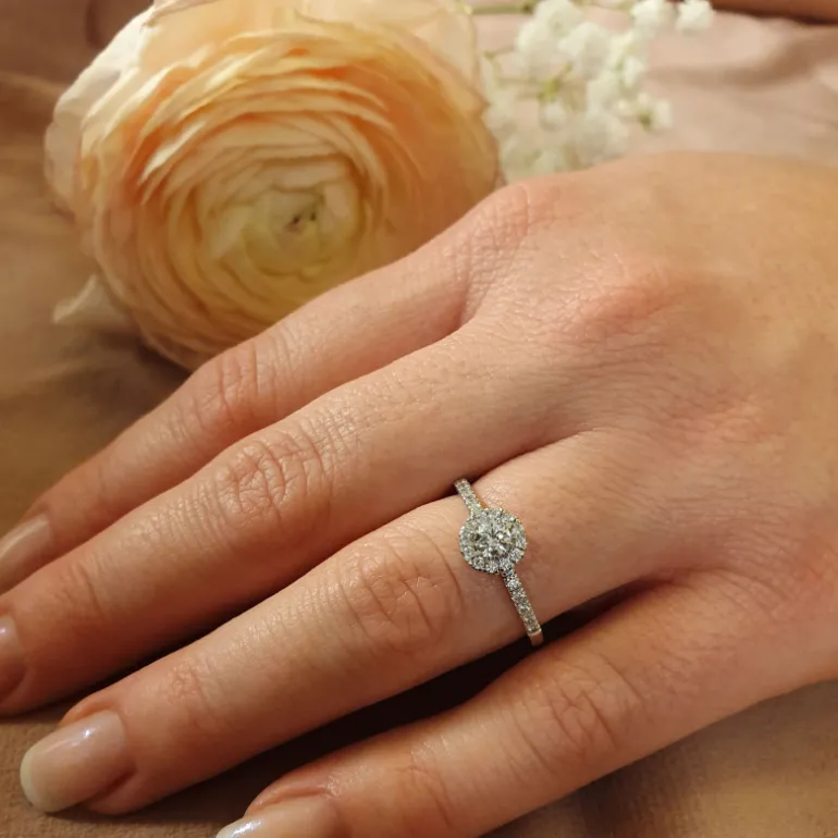 Klockarberg – haloring med större diamant i mitten omgiven av flera diamanter runt om från vår egen kollektion Dalecarlia Love Collection