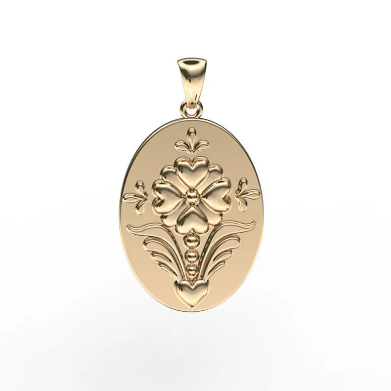 Kurbitssmycke i guld storlek mellan, oval amulett, smycke från Dalecarlia of Sweden i äkta guld 18 karat. Vacker dekoration med fyra hjärtan som bildar en blomma, lyckoklöver, kurbitsblad och dekorationer inspirerad från vackra kurbitsmålningar.