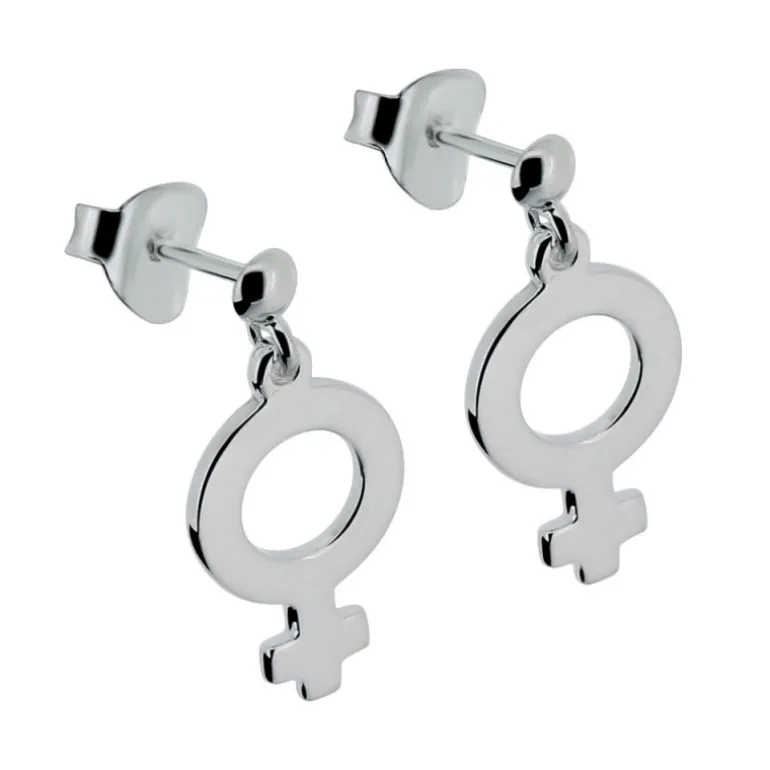 Feminist, örhängen med kvinnosymbol. Hängande silverörhängen med symbolen för kvinna. Material äkta silver 925.