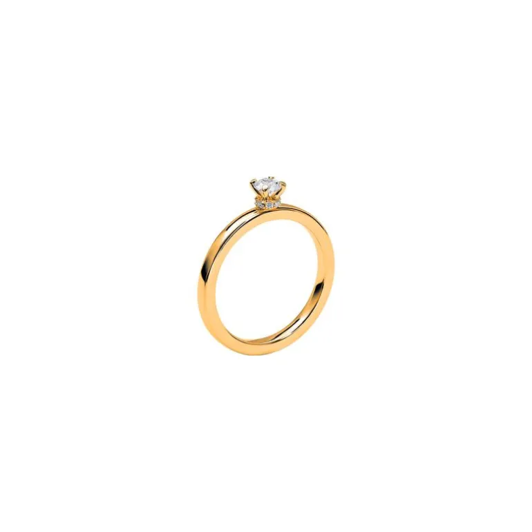 Ring med diamant infattad i fattning med fyra klor och längre ner runt om fattningen sitter flera små diamanter, Love 13 från Schalins ringar.