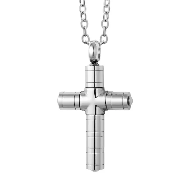 Halsband med kors i rostfritt stål, höjd på korset 28 mm, bredd 16,2 mm. Kedjan justerbar i längd 50-55 cm.