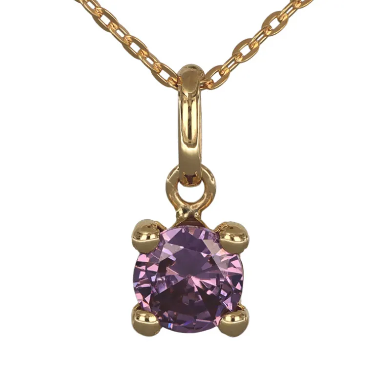 Halsband med månadssten smycke för månad februari i äkta guld 9 karat. Storlek på stenen 5 mm i diameter, höjd på smycket inklusive ögla 11 mm. Färgad syntetisk lila sten liknande en ametist. Kedja modell ankar, bredd 0,6 mm artikel 9-50-0001. Material äkta guld 9 karat, det vill säga en blandning, legering, av 37,5% guld och resten silver och koppar.