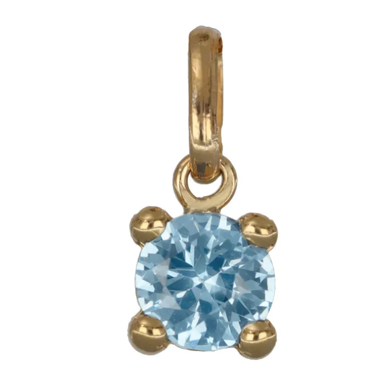 Månadssten smycke för månad mars äkta guld 9 karat. Storlek på stenen 5 mm i diameter, höjd på smycket inklusive ögla 11 mm. Färgad syntetisk sten liknande aquamarin.