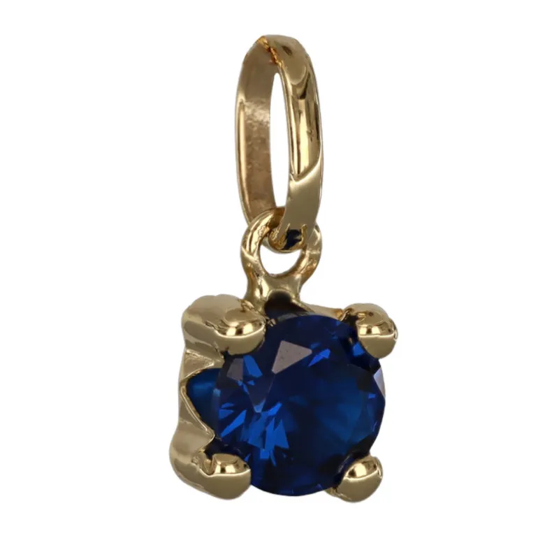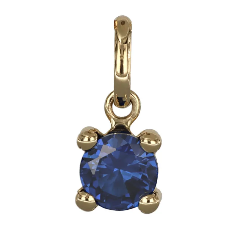 Månadssten smycke för månad september äkta guld 9 karat. Storlek på stenen 5 mm i diameter, höjd på smycket inklusive ögla 11 mm. Färgad syntetisk sten liknande safir.