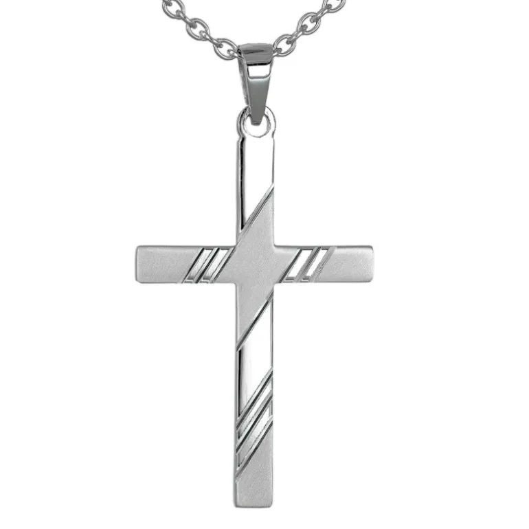 Mönstrat kors, halsband med snyggt silverkors och kedja äkta silver 925. På framsidan matterade och blanka ytor med graverad dekor, blank på baksidan. Höjd på korset inklusive ögla 32 mm, bredd 17 mm och tjocklek 1,15 mm. Välj önskad längd på kedjan vid beställningen.