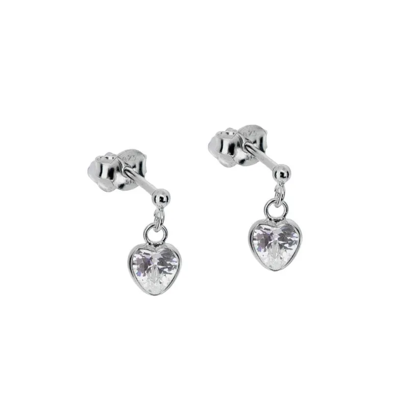 Hängande silverörhängen med vita gnistrande hjärtan.