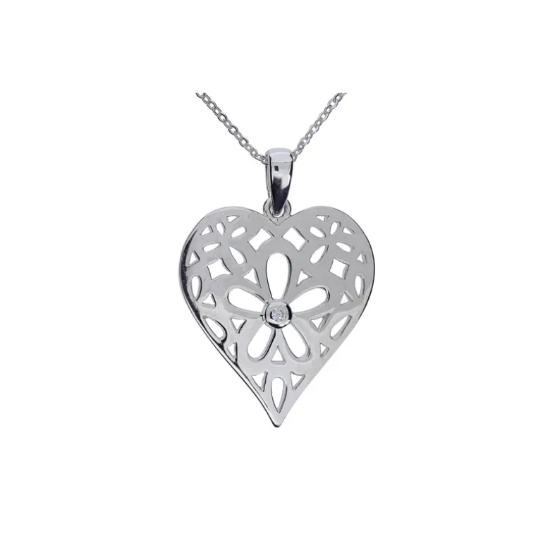 Genombrutet hjärta med mönster och blomma med vit sten.