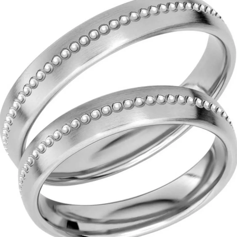Reflection 11, snyggt mönstrad förlovningsring och vigselring. Vitguldsring vitt guld 18 karat med mönster som små kulor runt hela ringen. Tillverkad av Schalins ringar i Östersund.