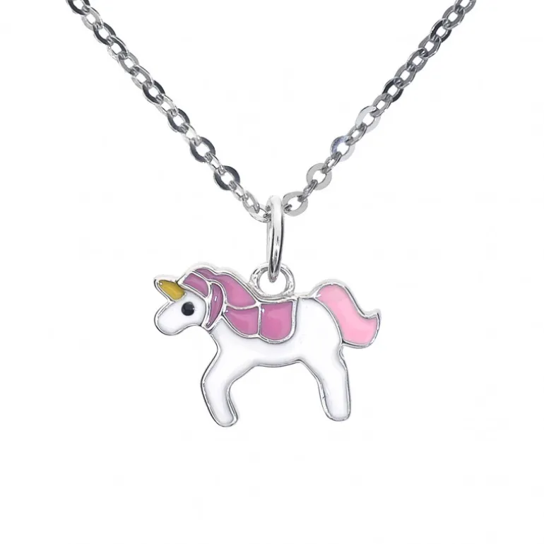 Halsband med rosa och vit enhörning i äkta silver 925, kedja ingår.